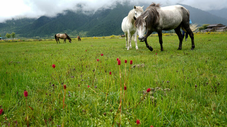 समथर फाँट र भिरालो पाखामा फुलेका रंगीचंगी फूल । चरन क्षेत्रमा रमाइरहेका घरपालुवा जनावरको बथान । पहाडका टाकुराबाट पृष्ठभूमिमा देखिने हिमाल ।