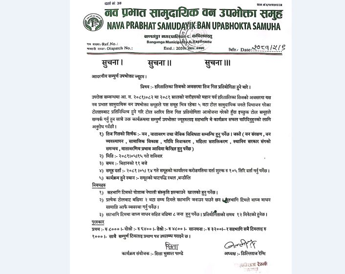 नव प्रभात सामुदायिक वन उपभोक्ता समुह बाणगंगा ८ कपिलवस्तुले हरितालिका तीजको अवसरमा टोल स्तरिय तीज गीत प्रतियोगिता आयोजना गर्दैछ। यहि भदौ १५ गते आज समुह भित्र रहेका ५ वटा टोल सामुदायिक वनले विभाजन गरेका टोलहरुबाट प्रतिनिधित्व हुने गरि टोल स्तरिय तीज गीत प्रतियोगिता आयोजना गर्न लागेको अध्यक्ष डिल्लीराज रेग्मीले जानकारी दिनुभयो ।