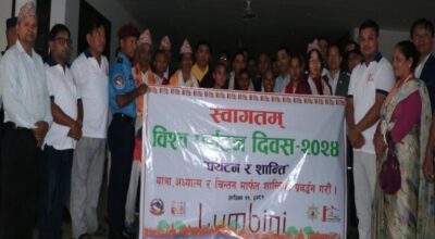 बुटवल।विश्व पर्यटन दिवसका अवसरमा शुक्रवार बुद्धजन्मस्थल लुम्बिनीमा पर्यटकलाई नेपाली ढाका टोपी लगाएर स्वागत गरिएको छ