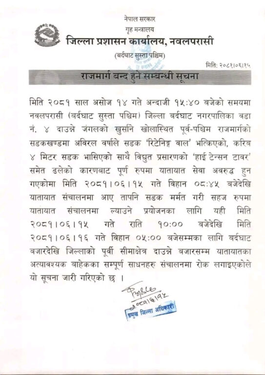 जिल्ला प्रशासन कार्यालय नवलपरासीले मंगलबार एक सूचना प्रकाशित गर्दै १५ असोज राति १० बजेदेखि १६ असोज बिहान ५ बजेसम्म यो खण्ड पूर्ण रूपमा बन्द हुने जनाएको छ ।
