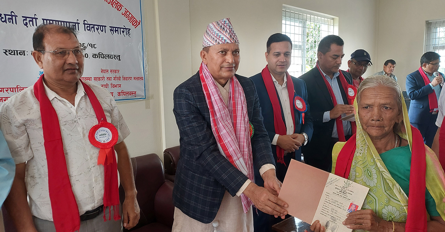 भूमि व्यवस्था, सहकारी तथा गरिवी निवारण मन्त्री बलराम अधिकारीले चार सय ५८ थान लालपूर्जा वितरण गरेका छन् । शुक्रबार मन्त्री अधिकारीले बाणगंगा नगरपालिका वडा नं १० पटना मेचपुरी का ९६ र कपिलवस्त नगरपालिका वडा नं ७ का २२ र कुष्णनगर नगरपालिका वडा नम्बर १२ हिदयनगर का तीन सय ४० गरी चार सय ५८ थान लाल पूर्जा वितरण गरेका हुन्।