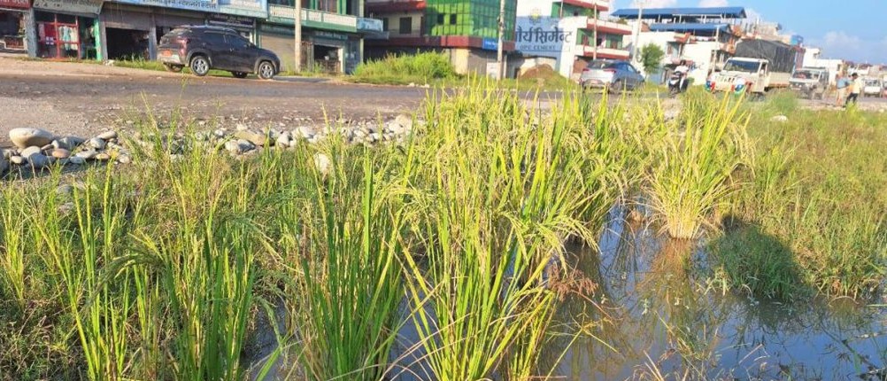 विस्तारको काम रोकिएपछि पूर्वी नवलपरासीको गैंडाकोट नगरपालिका वडा नं. ५ मा पर्ने सडक क्षेत्रका खाल्डामा धान फलेको देखिन्छ ।