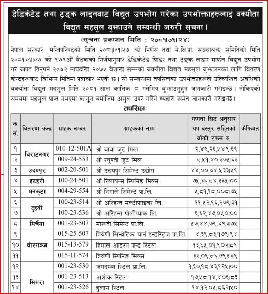 नेपाल विद्युत् प्राधिकरणले डेडिकेटेड र ट्रङ्कलाइनबाट विद्युत् उपभोग गरेका ४९ उद्योगको सूची सार्वजनिक गर्दै आउँदो कात्तिक ८ गतेभित्र बक्यौता रकम बुझाउन अनुरोध गरेको छ । तोकिएको समय अवधिभित्र महसुल नबुझाएमा कानुन बमोजिम असुल गर्ने प्राधिकरणले जनाएको छ ।