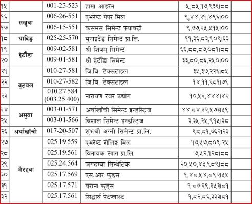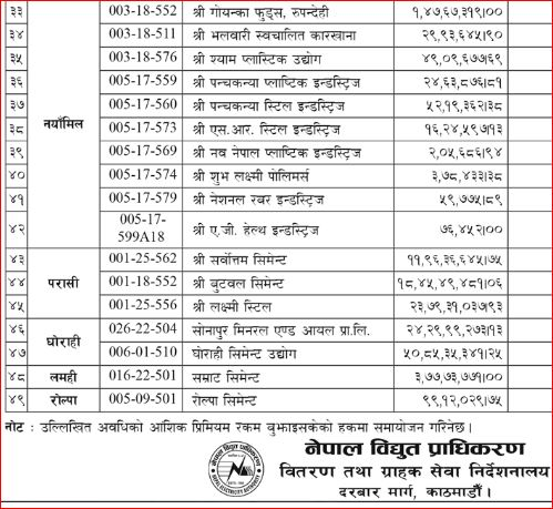 प्राधिकरणले आज सार्वजनिक सूचना निकालेर २०७२ माघदेखि २०७५ वैशाखसम्मको बक्यौता रकम तिर्न ४९ वटा उद्योगलाई पुनः ताकेता गरेको हो । यसअघि पनि प्राधिकरणले बक्यौता तिर्न अनुरोध गरेको थियो । तर केही उद्योगीले महसुल तिर्न अटेरी गर्दै आएका छन् । आंशिक प्रिमियम रकम बुझाइसकेकाको हकमा भने रकम समायोजन गरिने सूचनामा उल्लेख छ ।