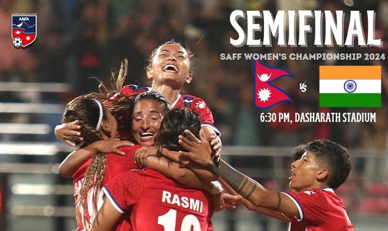 साफ महिला च्याम्पियनसिपको फाइनलमा पुग्न घरेलु टोली नेपालले आज भारतसँग खेल्दैछ । खेल दशरथ रङ्गशालामा बेलुका साढे ६ बजे शुरु हुनेछ । नेपाली महिला टोलीले साफ च्याम्पियनसिपको सेमिफाइनलमा लगातार दोस्रोपल्ट भारतसँग खेल्न लागेको हो ।