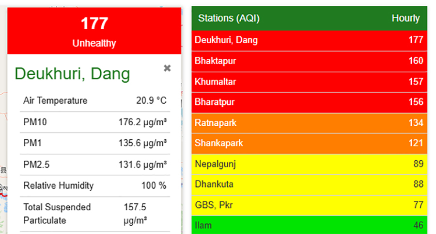 सबैभन्दा बढी वायु प्रदूषण दाङ देउखुरीमा छ । बिहान सवा आठ बजेको समयमा त्यहाँको वायु गुणस्तर सूचक (एक्यूआई)