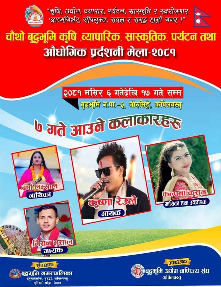 कपिलवस्तुको बूद्धभूमि नगरपालिका २ गोरुसिंगेमा संचालित चौथो बुद्धभूमि महोत्सवको दोस्रो दिन विभिन्न कलाकारको प्रस्तुती रहने छ । आज शुक्रबार कृष्ण रेउले, कल्पना कुसुम, वर्षा लम्साल, मिसन भुसाल लगायतका कलाकारहरुको प्रस्तुती रहने महोत्सव आयोजक बुद्धभूमि उद्योग बाणिज्य संघले जनाएको छ।
