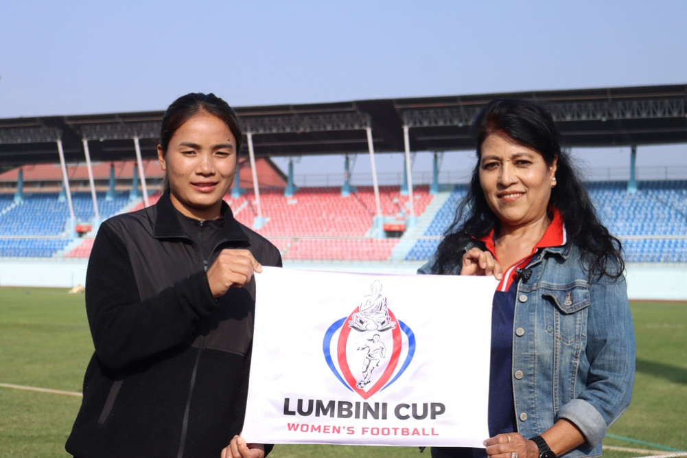 नेपाली राष्ट्रिय महिला फुटबल टिमकी पहिलो कप्तान रमा सिंह र वर्तमान कप्तान एन्जिला तुम्बाप्पो सुब्बाले संयुक्त रुपमा लुम्बिनी कपको लोगो सार्वजनिक गरे।