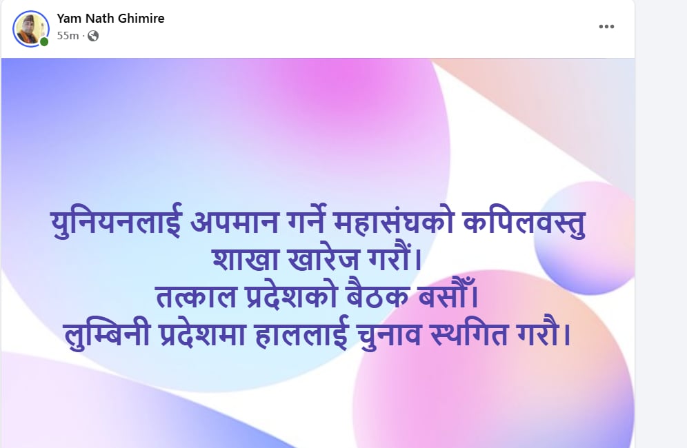 कपिलवस्तु प्रेस युनियनलाई अपमान गर्ने र पत्रकारिताको मर्यादा भंग गर्ने कार्यप्रति गम्भीर आपत्ति जनाउँदै नेपाल पत्रकार महासंघ लुम्बिनी प्रदेशका कोषाध्यक्ष यमनाथ घिमिरेले कपिलवस्तु शाखाको खारेजीको माग गरेका छन्। केहि बेर अघि सामाजिक संजालमा पोष्ट गर्दै प्रदेश कोषाध्यक्ष घिमिरेले लेखेका छन्, “तत्काल महासंघको प्रदेश कमिटिको वैठक बसौं ।”