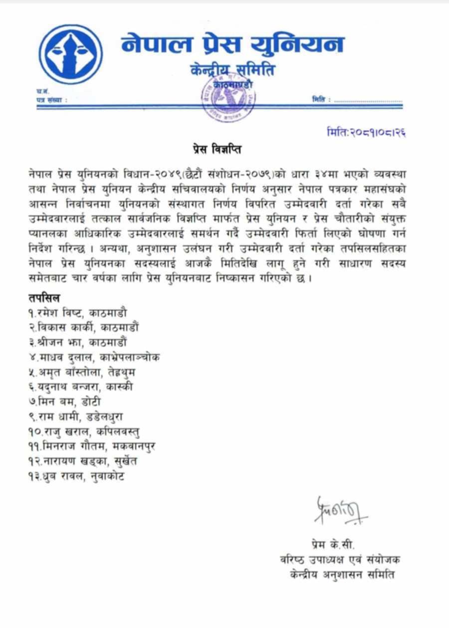अनुशासन उल्लघंन गरी उम्मेदवारी दर्ता गरेका नेपाल प्रेस युनियनका सदस्यलाई आजकै मितिदेखि लागु हुने गरी साधारण सदस्य समेतबाट ४ वर्षका लागि प्रेस युनियनबाट निष्कासन गरेको जनाएको छ ।