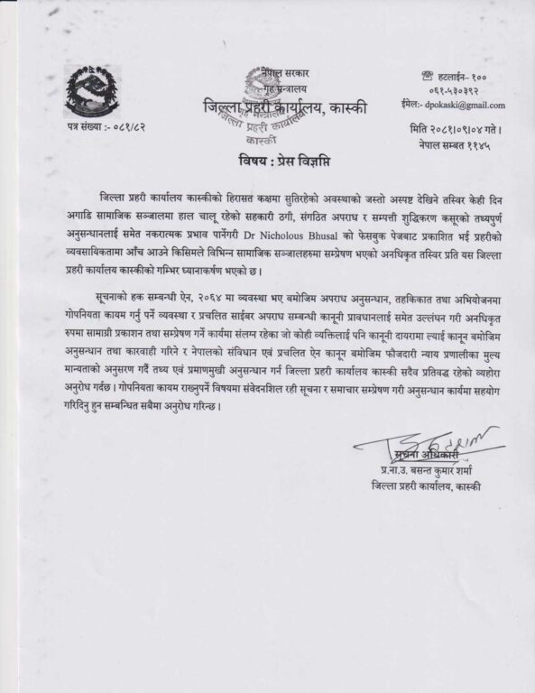 जिल्ला प्रहरी कार्यालय, कास्कीले विज्ञप्ति जारी गर्दै अपराध अनुसन्धान, तहकिकात तथा अभियोजनमा गोपनियता कायम गर्नुपर्ने व्यवस्था र प्रचलित साइबर अपराध सम्बन्धी कानुनी प्रावधानलाई समेत उल्लंघन गरी अनधिकृत रुपमा सामाग्री प्रकाशन तथा सम्प्रेषण गर्ने कार्यमा संलग्न रहेका जो कोही व्यक्तिलाई पनि कानुनी दायरामा ल्याई कानुन बमोजिम अनुसन्धान तथा कारबाही गर्ने जनाएको छ ।
