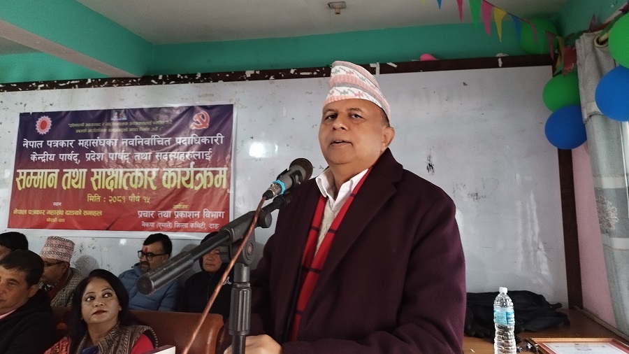 एमाले दाङको प्रचार तथा प्रकाशन विभागले नेपाल पत्रकार महासङ्घका नवनिर्वाचित पदाधिकारी, केन्द्रीय पार्षद्, प्रदेश पार्षद् तथा सदस्यहरूको सम्मानमा आज दाङको घोराहीमा आयोजना गरेको कार्यक्रममा महासचिव पोखरेलले मुलुकमा राजनीतिक स्थिरता, अर्थतन्त्र सुधार र सुशासनका पक्षमा काम गरिरहेको सरकारलाई साथ दिन सबैसँग अनुरोध गर्नुभयो ।
