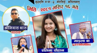 कपिलवस्तु । चौथो बुद्धभूमि महोत्सवमा १६ गते आइताबार चर्चित गायिका एलिना चौहानको प्रस्तुती रहने छ।