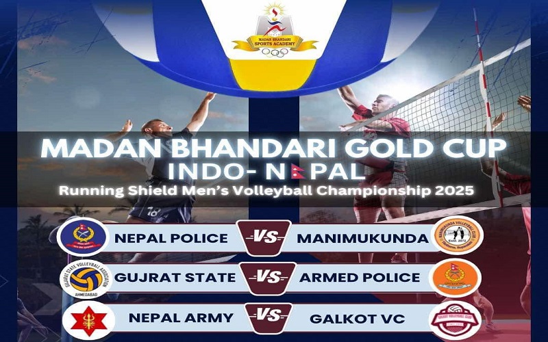 इन्डो–नेपाल रनिङ शिल्ड पुरुष भलिबलमा आज तीन वटा खेल हुँदैछन् । आज हुने पहिलो खेलमा एपीएफ र भारतको गुजरात, दोस्रो खेलमा मणिमुकुन्द र पुलिस तथा तेस्रो खेलमा त्रिभुवन आर्मी क्लब र गल्कोटले खेल्दैछन् ।