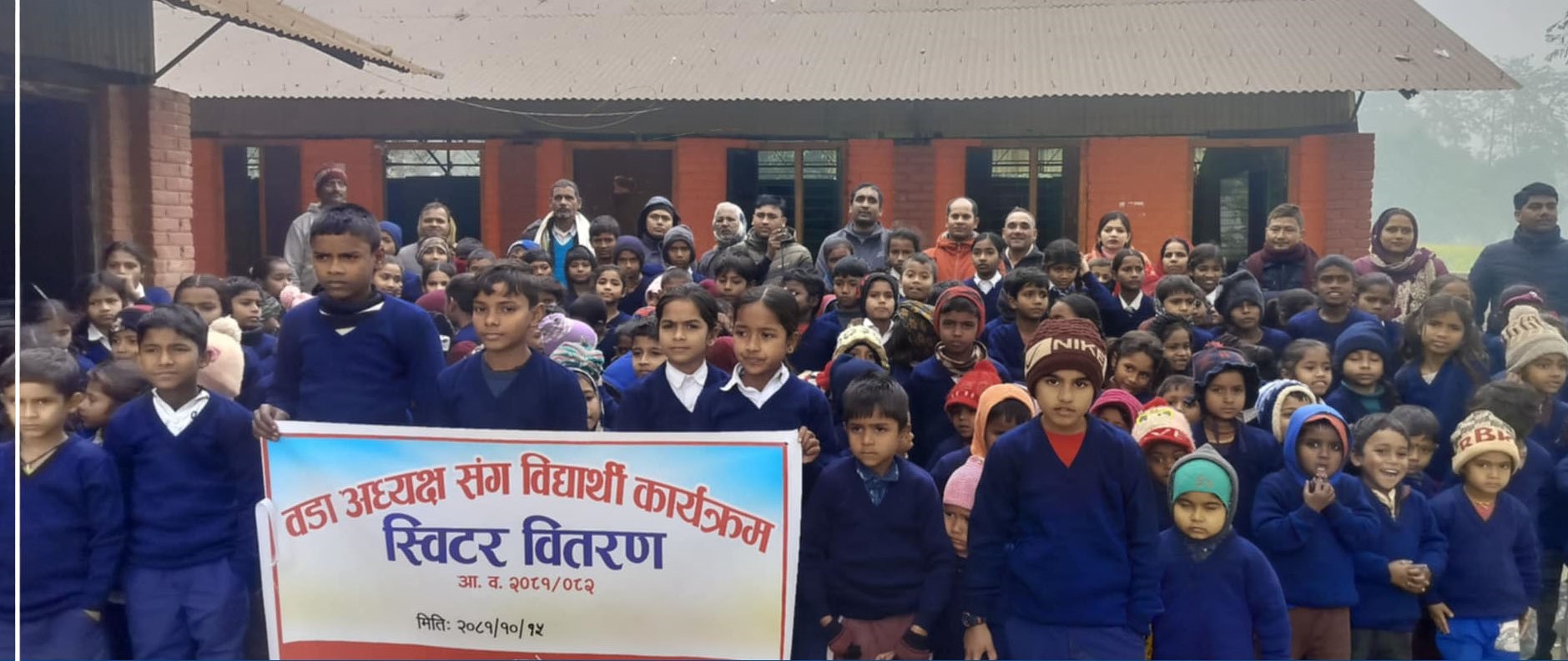 वडाका कक्षा १ देखी ५ कक्षा सम्म अध्ययनरत सम्पुर्ण विद्यार्थीलाई जाडोमा न्यानोको लागि स्विटर बितरण गर्न थालिएको वडा अध्यक्ष शैलेन्द्र कुमार यादवले बताए । बिगतका वर्षमा विद्यार्थीका लागि बिभिन्न शैक्षिक सामाग्री बितरण गरिने गरिएकोमा यस वर्ष स्विटर बितरण गरिएको अध्यक्ष यादवले स्पष्ट पारे । वडाका बाँकी विद्यालय र मदरसाका गरि कुल १ हजार ५ सय विद्यार्थीलाई स्विटर बितरण गर्ने लक्ष्य लिईएको उनले जानकारी दिए ।