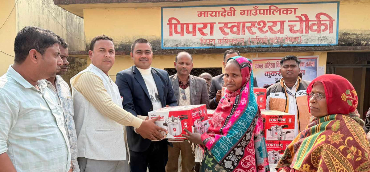 कपिलवस्तुको मायादेवी गाउँपालिका वडा नम्बर ४ पिपरामा वडाका एक महिला लाई प्रेसर कुकर तथा ज्येष्ठ नागरिक र अति विपन्न नागरिकलाई कम्मल वितरण गरिएको छ ।