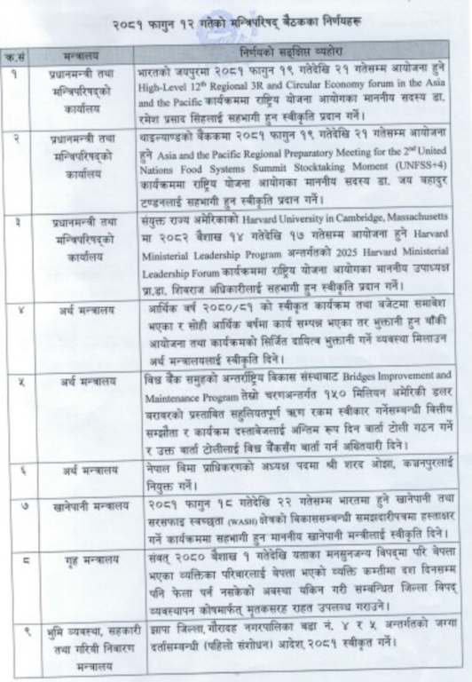 सरकारले सोमबार मन्त्रिपरिषद् बैठकले गरेका निर्णय सार्वजनिक गरेको छ । सरकारका प्रवक्तासमेत रहेका सञ्चार तथा सूचना प्रविधिमन्त्री पृथ्वीसुब्बा गुरुङले मन्त्रिपरिषद्को निर्णय सार्वजनिक गरेका हुन् ।