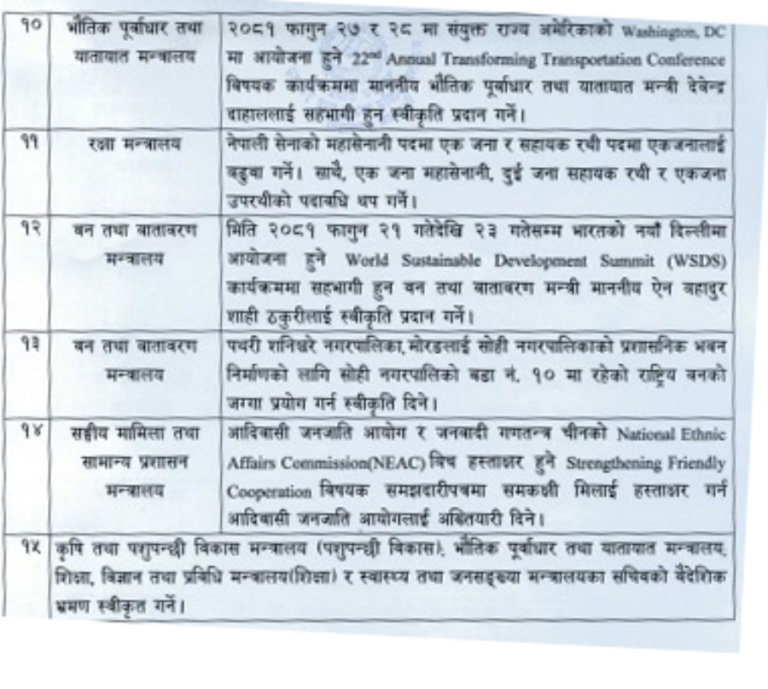 त्यस्तै नेपाली सेनाको महासेनानी पदमा एकजना र सहायक रथी पदमा एक जना बढुवा गर्ने साथै एकजना महासेनानी, २ जना सहायक रथी र एकजना उपरथीको पदावधि थप गर्नेलगायत विभिन्न १५ निर्णय गरेको छ।