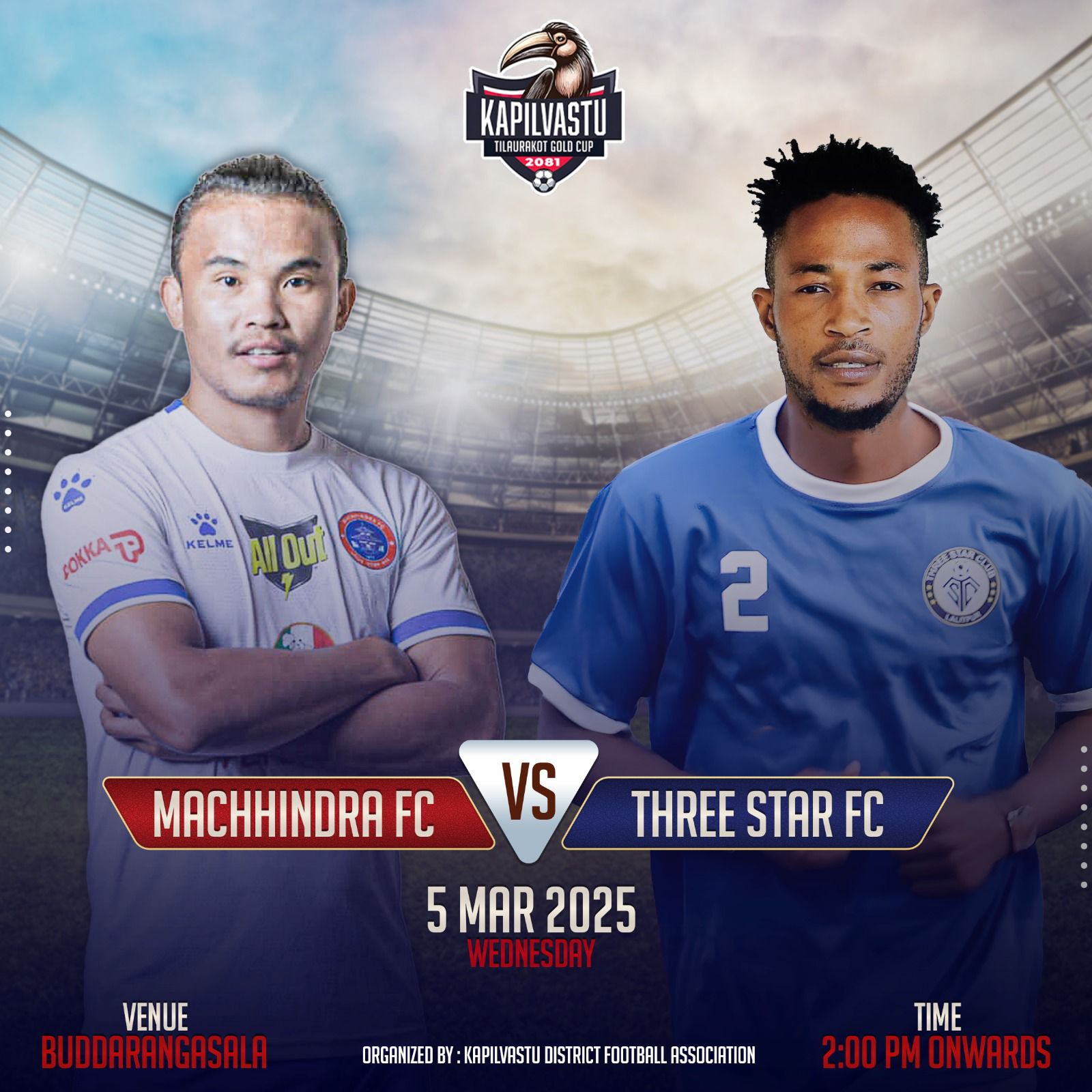 कपिलवस्तुको बुद्धरंगशालामा जारी दोस्रो मुख्यमन्त्री कपिलवस्तु तिलौराकोट गोल्डकप फुटबल प्रतियोगिताको उपाधिका लागि मच्छिन्द्र एफसी र थ्रीस्टार थ्रीस्टार क्लव भिड्ने भएका छन् । बुधबार दिउँसो साढे २ बजे फाइलन खेल सुरुहुने जिल्ला फुटबल संघ कपिलवस्तुका अध्यक्ष तिलक थापाले जानकारी दिए ।