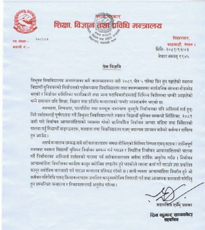 मन्त्रालयका प्रवक्ता शिवकुमार सापकोटाले विज्ञप्ति निकालेर त्रिभुनव विश्वविद्यालय (त्रिवि) को भोलि हुन गइरहेको स्ववियु चुनाव शान्तिपूर्ण रुपमा गराउन र निर्वाचन आचारसहिंताको पालना गर्न सबै विद्यार्थी सङ्गठनलाई अनुरोध गर्नुभएको हो ।