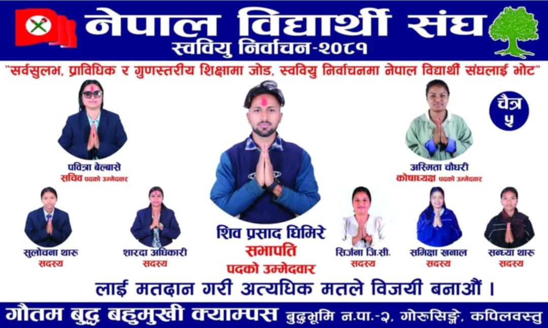 गौतमबुद्ध बहुमूखी क्याम्पस बुद्धभूमि नगरपालिका २ गोरुसिंगेमा नेविसंघको प्यानलै विजयी भएको छ । मंगलबार साझ सम्पन्न मतपरिणाम अनुसार क्याम्पसको स्ववियु सभापतिमा नेपाल विद्यार्थी संघका शिव प्रसाद घिमिरे १ सय २६ मत सहित निर्वाचित भएका हुन् । उनका प्रतिद्धन्दी दिलिप थारुले १ सय १० मत प्राप्त गरे । यसैगरी सचिवमा नेविसंघकी पवित्रा बेल्वासे १ सय २६ मत सहित निर्वाचित भएकी छन् भने प्रतिद्धन्दी अनेरास्ववियुकी रुपा भरले १ सय ६ मत प्राप्त गरिन् । कोषाध्यक्षमा नेपाल विद्यार्थी संघकी अस्मिता चौधरीले १ सय ३६ मत ल्याउदै निर्वाचित भइन् भने प्रतिद्धन्दी अनेरास्ववियुका विमल अधिकारीले ९३ मत प्राप्त गरे यसैगरी सदस्यहरुमा क्रमसः नेविसंघका शारदा अधिकारी, सुजना जिसी, समिक्षा खनाल, सम्झाना थारु र अनेरास्ववियुकी अमृता थारु ीनर्वाचित भएकी छन् ।