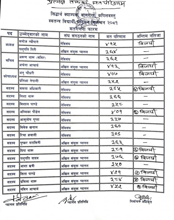 कपिलवस्तुको चर्चित सिद्धार्थ क्याम्पस बुड्चीमा ने।वि।संघले ऐतिहासिक जित निकालेको छ । चारदलीय गठबन्धन बनाएका अनेरास्ववियु उम्मेदवार पशुपति गिरीलाई ५१ मतान्तरले पराजित गर्दै ने.वि.संघका मनोज न्यौपाने सभापतिमा निर्वाचित भएका छन्। ८०१ मत खसेकोमा ने।वि।संघका मनोज न्यौपानेले ४१५ मत प्राप्त गर्दा अनेरास्ववियुका पशुपति गिरीले ३६४ मत प्राप्त गरेका छन् ।