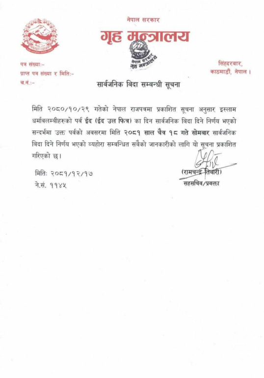 विज्ञप्तिमा “चैत १८ गते सोमवार सार्वजनिक बिदा दिने निर्णय भएको व्यहोरा सम्बन्धित सबैको जानकारीका लागि यो सूचना प्रकाशित गरिएको छ” उल्लेख छ।