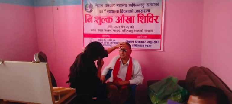 यसैबीच महासंघ कपिलवस्तुले स्थापना दिवसको अवसरमा संचारकर्मीको निःशुल्क आँखा जाँच गरेको छ । आँखा मानव जीवनको संबेदनशील अंग भएकाले संचारकर्मीको निःशुल्क आँखा परिक्षण गरिएको महासंघका अध्यक्ष डिलाराम भुसालले बताए ।