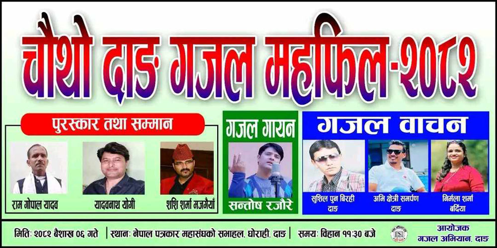 घोराहीमा चौथो दाङ गजल महफिल हुने भएको छ । गजल साहित्यको प्रवर्धन र गजल विधामा क्रियाशील स्रष्टाहरूलाई सम्मान गर्ने उद्देश्यले दाङमा चौथो दाङ गजल महफिल–२०८२ हुने भएको हो ।