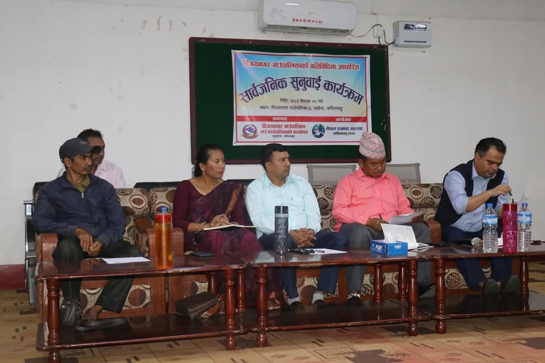 कपिलवस्तुको विजयनगर गाउँपालिकाको सार्वजनिक सुनुवाई कार्यक्रम सम्पन्न भएको छ । नेपाल पत्रकार महासंघ कपिलवस्तुको आयोजना र विजयनगर गाउँपालिकाको समन्वयमा सार्वजनिक सुनुवाई कार्यक्रम गरिएको हो । गाउँपालिकाको सुशासन, पारदर्शिता र जवाफदेहिताका लागि सार्वजनिक सुनुवाई गरिएको हो ।