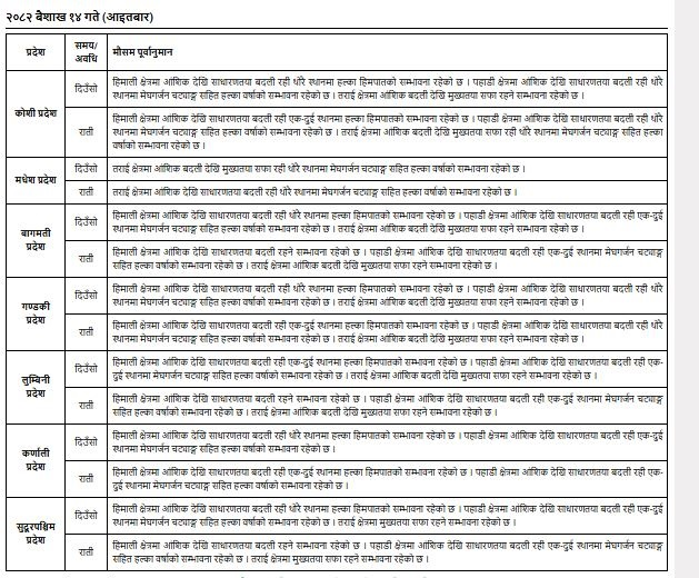 यसैबीच भोलि बेलुकीदेखि प्रिमनसुनी प्रणाली फेरि सक्रिय हुने र पानी पर्ने मौसमविदले बताएका छन् । त्रिभुवन विश्वविद्यालयको जल तथा मौसम केन्द्रीय विभागमा कार्यरत मौसमविद विनोद पोखरेलका अनुसार भोलि र पर्सि देशको पूर्वी र मध्य भेगमा पानी पर्नेछ ।