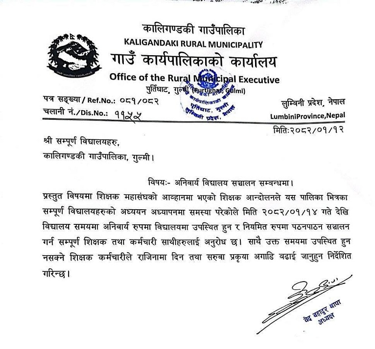 कालीगण्डकी गाउँपालिका अध्यक्ष बेदबहादुर थापाले हिजो विज्ञप्ती निकालेर भोलिदेखि अनिवार्य रूपमा विद्यालय खोल्न निर्देशन दिनुभएको हो ।