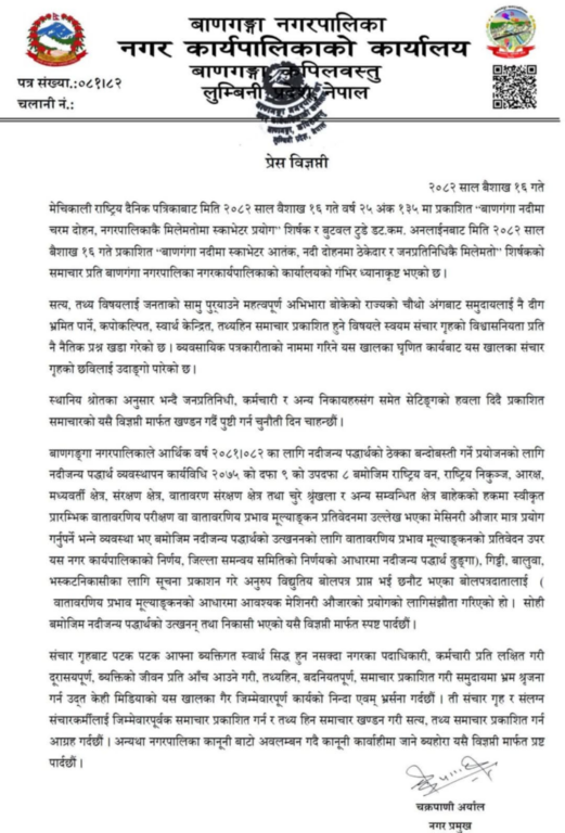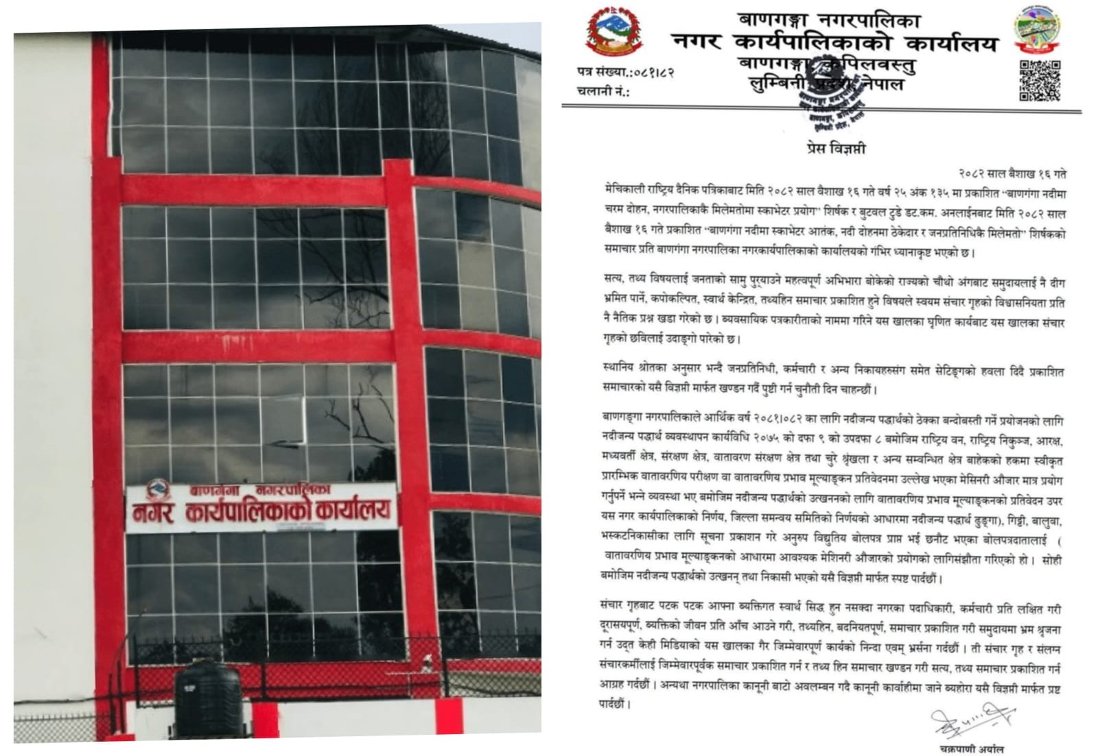 ‘२०८२ साल बैशाख १६ गते मेचिकाली राष्ट्रिय दैनिक पत्रिकाबाट मिति २०८२ साल वैशाख १६ गते वर्ष २५ अंक १३५ मा प्रकाशित “बाणगंगा नदीमा चरम दोहन, नगरपालिकाकै मिलेमतोमा स्काभेटर प्रयोग” शिर्षक र बुटवल टुडे डट कम अनलाईनबाट मिति २०८२ साल बैशाख १६ गते प्रकाशित “बाणगंगा नदीमा स्काभेटर आतंक, नदी दोहनमा ठेकेदार र जनप्रतिनिधिकै मिलेमतो” शिर्षकको समाचार प्रति बाणगंगा नगरपालिका नगरकार्यपालिकाको कार्यालयको गंभिर ध्यानाकृष्ट भएको छ । सत्य, तथ्य विषयलाई जनताको सामु पुर्याउने महत्वपूर्ण अभिभारा बोकेको राज्यको चौथो अंगबाट समुदायलाई नै दीग भ्रमित पार्ने, कपोकल्पित, स्वार्थ केन्द्रित, तथ्यहिन समाचार प्रकाशित हुने विषयले स्वयम संचार गृहको विश्वासनियता प्रति नै नैतिक प्रश्न खडा गरेको छ । व्यवसायिक पत्रकारीताको नाममा गरिने यस खालका घृणित कार्यबाट यस खालका संचार गृहको छविलाई उदाङ्गो पारेको छ,’ उक्त विज्ञप्तिमा भनिएको छ ।