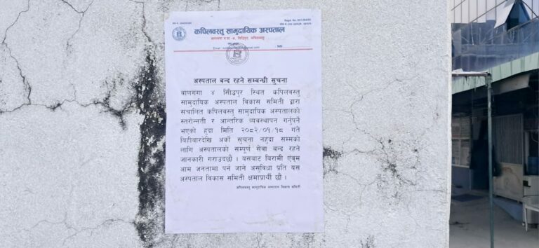 कपिलवस्तुको बाणगंगा ४ सिद्धिपुरमा रहेको कपिलवस्तु सामुदायिक अस्पताल आर्थिक अभावको कारण सम्पूर्ण सेवाहरु बन्द भएको जनाएको छ। अस्पतालको मुलगेटमा सूचना टास गर्दै अस्पतालको स्तरोन्नति र आन्तरिक व्यवस्थापन गर्नुपर्ने आवश्यकता देखाउँदै अस्पताल विकास समितिले अर्को सूचना नआउदा सम्म सेवा स्थगन गर्ने निर्णय गरेको हो।