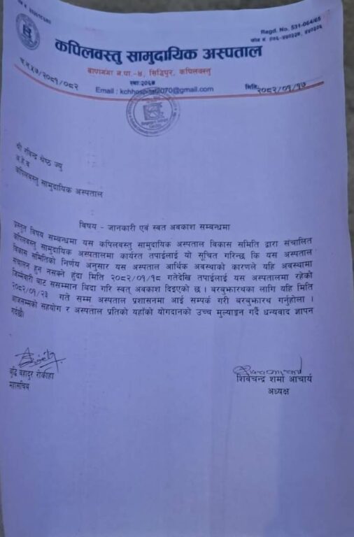त्यस्तै कपिलवस्तु सामुदायिक अस्पतालका प्रशासन प्रमुख चन्द्रकान्त पोख्रेलले संस्थाको हितलाई सर्वोपरी ठानेर आफुलाई अवकाश पत्र दिएको जानकारी दिनुभयो । उहाँले शुरुवाती अवस्थादेखि नै अस्पतालको व्ययभार बढेकाले त्यसको निरन्तरता स्वरुप आर्थिक जटिलता आएकाले आउने दिनमा व्यवस्थापनको लागि केही समय अस्पतालको सेवा बन्द गर्ने निर्णय गर्दै संचालक समितिले यो कदम उठाएको र आफुपनि विदा भएको बताउनुभयो ।