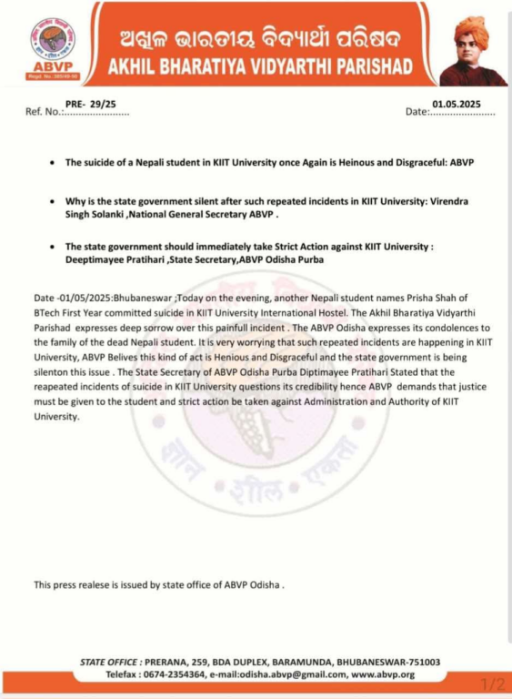 केआईआईटीविरूद्ध तत्काल कडा कारबाही गर्न एबीभीपीको माग