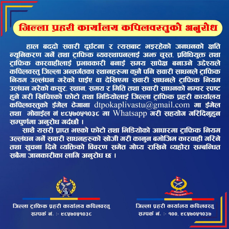 कपिलवस्तुमा सडक दुर्घटना बढ्न थाले पछि दुर्घटना न्यूनिकरणका लागि कपिलवस्तु प्रहरीले नँया प्रयास थालेको छ । दुर्घटना र यसबाट भैरहेको जनधनको क्षतीलाई न्यूनिकरण गर्दै ट्राफिक नियमलाई चुस्तदुरुस्त बनाउन भन्दै ट्राफिक नियम उल्लङ्घन गर्ने सवारीको नम्बर प्लेट स्पष्ट देखिएको भिडियो खिचेर आफुहरुलाई पठाउन आम नागरिक सबैमा आग्रह गरेको हो । जिल्ला प्रहरी कार्यालय कपिलवस्तुले एक सुचना जारी गर्दै ट्राफिक नियम उल्लङ्घन गरेका जुनसुकै सवारी साधनको पनि फोटो वा भिडियो खिचेर पठाउन आग्रह गरेको हो ।