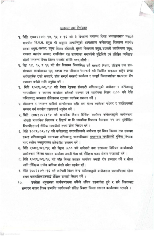 कपिलवस्तुमा ३ दिनसम्म विविध कार्यक्रम गरी गणतन्त्र दिवस मनाइने भएको छ । गृह मन्त्रालयको परिपत्र अनुसार कपिलवस्तुमा पनि भब्यताका साथ दिवस मनाउन लागिएको हो ।