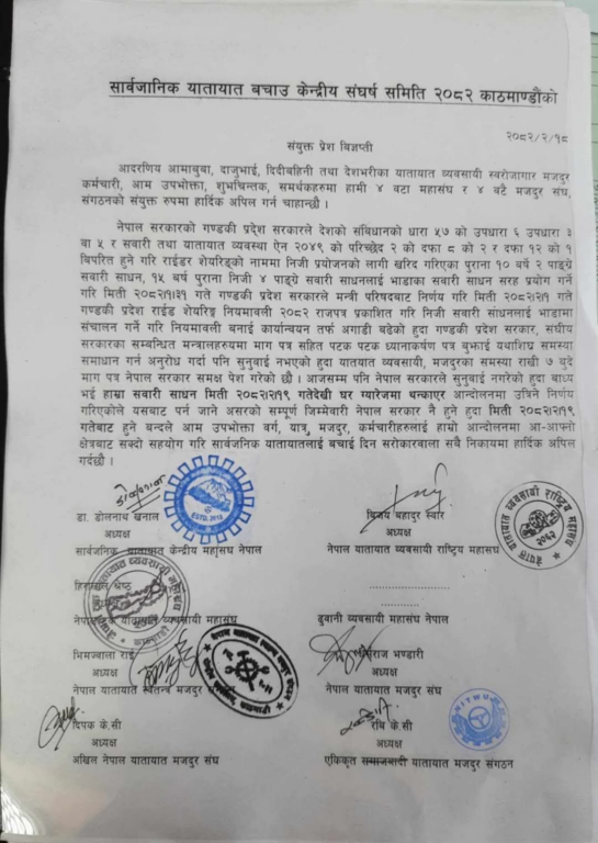 यसैबिच आइतबार ‘सार्वजनिक यातायात बचाउ केन्द्रीय संघर्ष समिति’को नामबाट जारी भएको विज्ञप्तिमा भनिएको छ, ‘यसबाट पर्न जाने असरको सम्पूर्ण जिम्मेवारी नेपाल सरकार नै हुने हुँदा मिति २०८२-२-१९ गतेबाट हुने बन्दले आम उपभोक्ता वर्ग, यात्रु, मजदुर, कर्मचारीहरूलाई हाम्रो आन्दोलनमा आ–आफ्नो क्षेत्रबाट सक्दो सहयोग गरी सार्वजनिक यातायातलाई बचाई दिन सरोकारवाला सबै निकायमा हार्दिक अपिल गर्दछौँ ।’