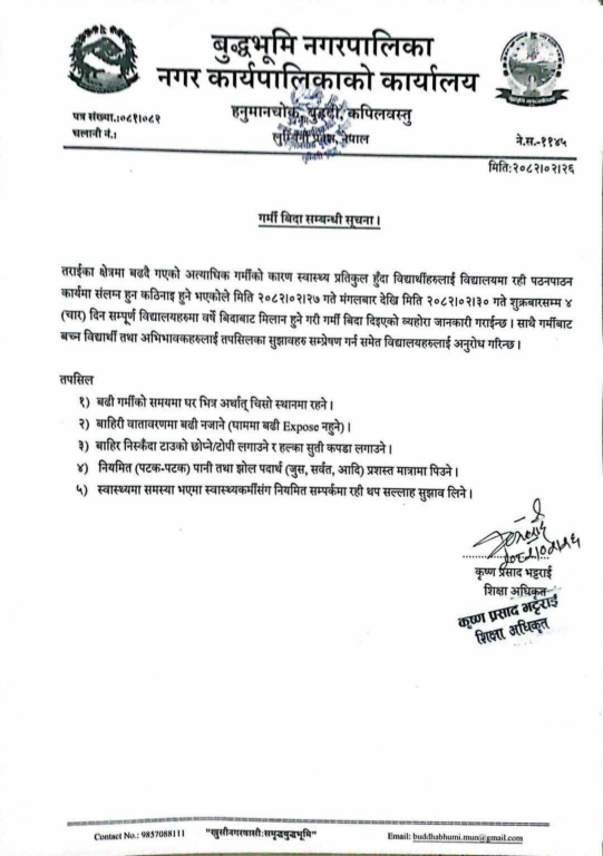 गर्मीका कारण पठन पाठनमा समस्या देखिएकाले तत्कालका लागि बिदा दिइएको बुद्धभूमि नगरपालिकाका मेयर केशव कुमार श्रेष्ठले बताए । ‘गर्मी तथा लू का कारण बालबालिकाको स्वास्थ्यमा प्रत्यक्ष असर पर्न सक्ने भएकाले विद्यालयमा बिदा दिइएको भन्दै सर्तकता अपनाउन नगरपालिकाका शिक्षा अधिकृत कृष्ण प्रसाद भटराईले आग्रह गरेका छन् ।यसअघि बाणगंगा नगरपालिकाले पनि ४ दिनसम्म गर्मी बिदा दिने निर्णय गरेको छ ।
