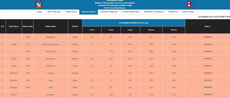 यस्तै बर्दियाकै दौलतपुरमा रहेको कर्णाली नदीमा पनि बाढी आएको छ । नारायणी नदीअन्तर्गत बागलुङको बोबाङ, पाल्पाको जाल्पा र कास्कीको लुम्लेमा पनि बाढी आएको महाशाखाले जनाएको छ । लगातार पानी परिरहेका अरू ठाउँमा पनि बाढीको जोखिम रहेकाले सावधानी अपनाउन महाशाखाले आग्रह गरेको छ ।