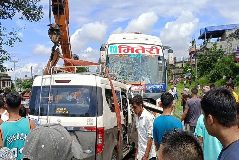 आज जिल्लाको राप्ति नगरपालिका भन्डारामा धनगढीबाट काँकडभित्तातर्फ जाँदै गरेको प्र।१–००१ ख ३५८३ नम्बरको बस र विपरीत दिशाबाट आउँदै गरेको प्र।३–००१ ज २९९ नम्बरको माइक्रो बस एक आपसमा ठोक्किँदा ७ जनाको मृत्यु भएको छ।