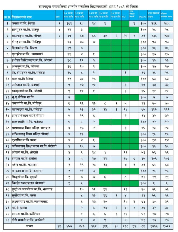 कपिलवस्तुको बाणगंगा नगरपालिकाले शिक्षाको गुणस्तरमा आमुल परिवर्तन गरेको छ । माध्यमिक शिक्षा परीक्षा (एसईई) मा सार्वजनिक भएको परीक्षाफलले यसको पुष्टि गरेको हो ।