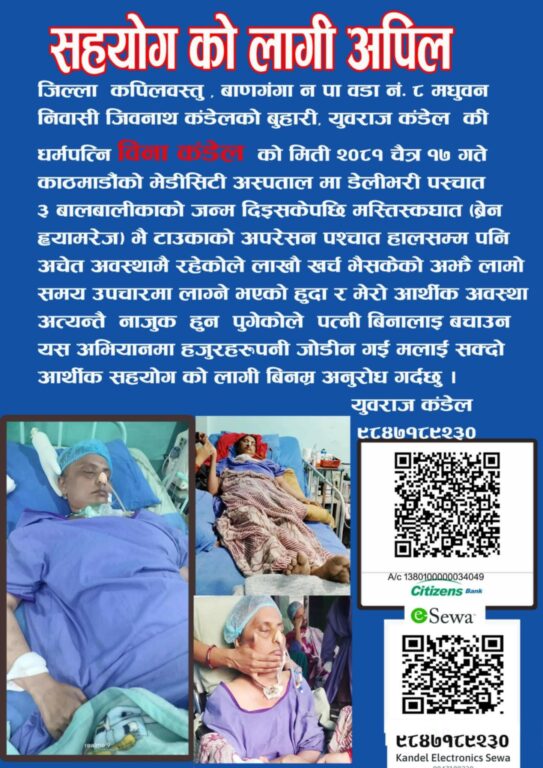 गत चैत्र १७ गते काठमाडौंको मेडिसिटी अस्पतालमा शल्यक्रियामार्फत तीन शिशुको जन्म दिएपछि बिना कडेललाई मस्तिष्कघात (ब्रेन स्ट्रोक) भएको थियो। त्यसयता उनको स्वास्थ्य अवस्था गम्भीर बनेको छ। लाखौँ रुपैयाँ खर्च भइसकेको भए पनि अझै थप उपचार आवश्यक भएको श्रीमान् युवराज कडेलले जानकारी दिनुभयो।