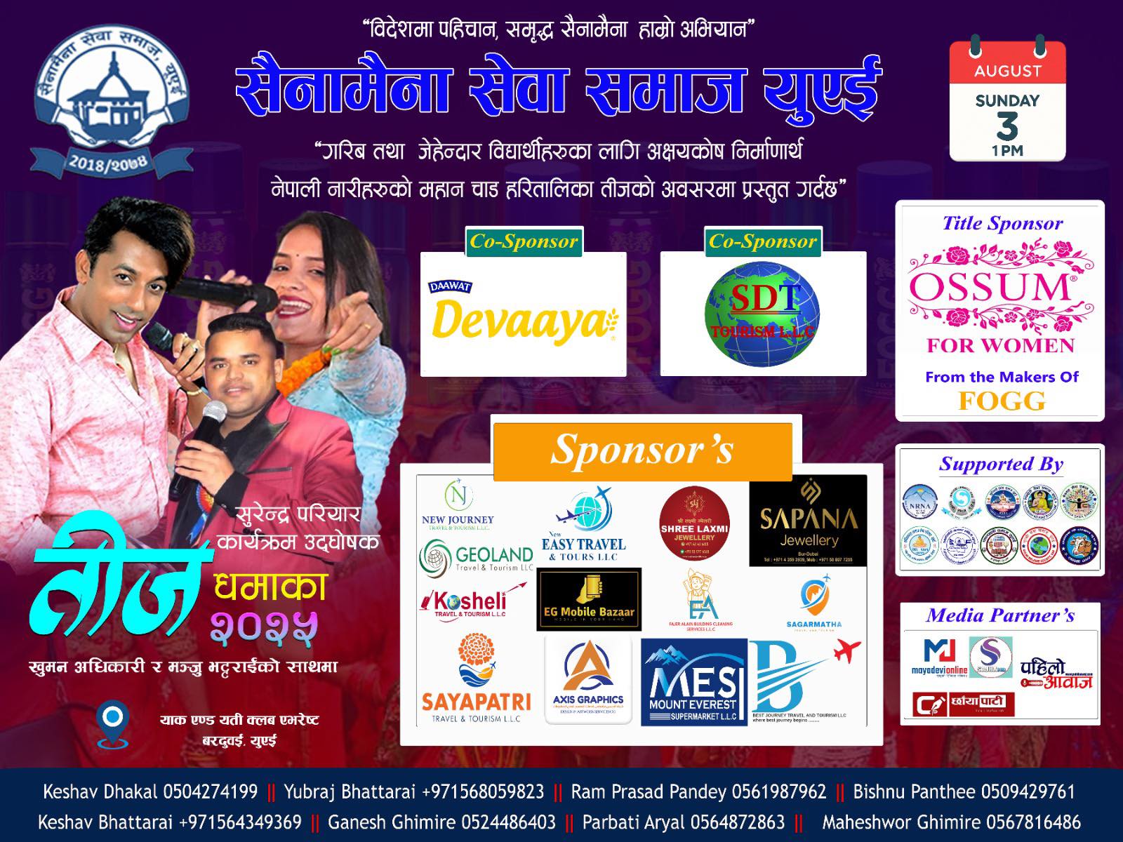 विदेशी भूमिमा नेपाली संस्कृति र सामाजिक सेवाको सन्देश फैलाउने उद्देश्यसहित सैनामैना सेवा समाज, यूएई ले “तीज धमाका २०२५” को तयारीलाई तिब्रता दिएकाे छ। यही आगामी अगस्त ३ आइतबारका दिन दुबईको क्लव एभरेष्ट याक एण्ड यति, बरदुबईमा आयोजना हुने भव्य कार्यक्रमलाई सफल बनाउन समाजका सम्पूर्ण पदाधिकारी, सल्लाहकार तथा संरक्षकहरू अहोरात्र खटिएका छन्।