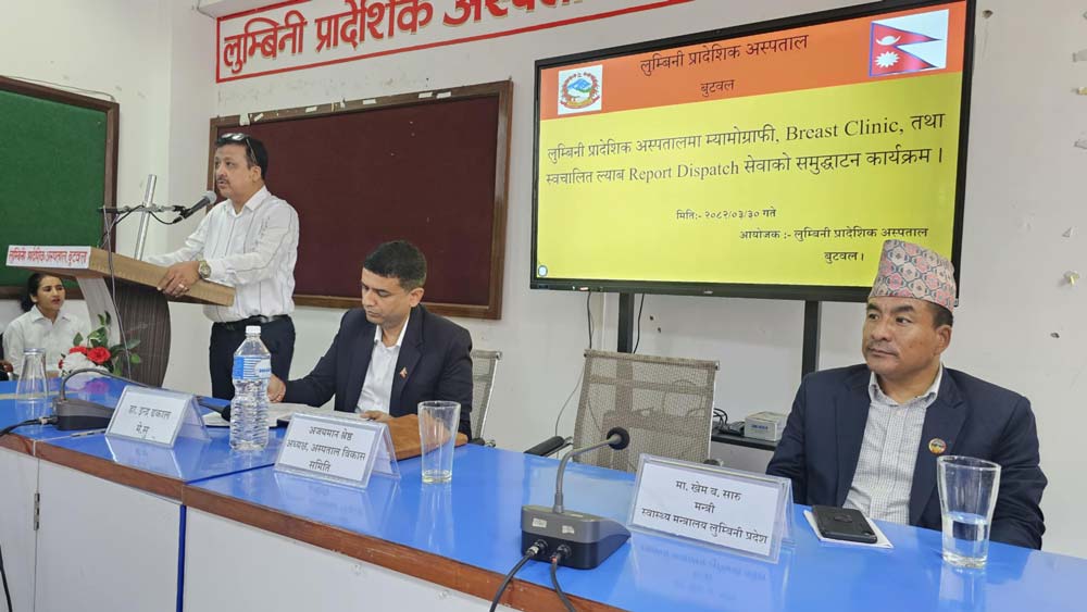 लुम्बिनी प्रदेशका स्वास्थ्यमन्त्री खेमबहादुर सारूले सोमबार म्यामोग्राफी तथा ब्रेस्ट क्लिनिक उद्घाटन गर्दै प्रदेशको स्वास्थ्य सेवामा नयाँ आयाम थपिएको बताउनुभयो । मन्त्री सारूले अस्पतालमा ‘स्वचालित ल्याब रिपोर्ट डिस्प्याच’ को समेत शुभारम्भ गर्नुभयो । अस्पतालमा स्थापना गरिएको म्यामोग्राफी सेवाले महिलाको स्तन क्यान्सरसम्बन्धी रोगको पहिचान तथा उपचारमा ठूलो सफलता मिल्ने अपेक्षा गरिएको छ । स्वचालित ल्याब रिपोर्ट डिस्प्याच मेसिनबाट सेवाग्राहीले आफैँ सम्पूर्ण रिपोर्ट बुझ्न पाउने भएका छन् ।