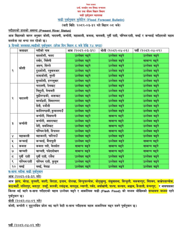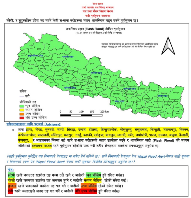 आज २९ जिल्लामा बाढीको मध्यम जोखिम रहेको छ । आज झापा, मोरङ, सुनसरी, सप्तरी, सिरहा, इलाम, दोलखा, सिन्धुपाञ्चोक, सोलुखुम्बु, सङ्खुवासभा, सिन्धुली, मकवानपुर, चितवन, काभ्रे, काठमाण्डौ, भक्तपुर, ललितपुरमा बाढीको मध्यम जोखिम रहेको बाढी पूर्वानुमान महाशाखाले जनाएको छ ।