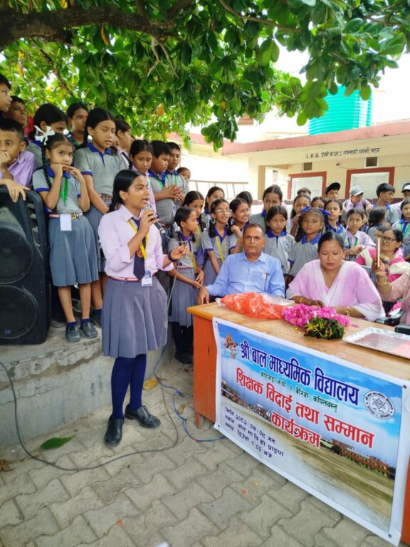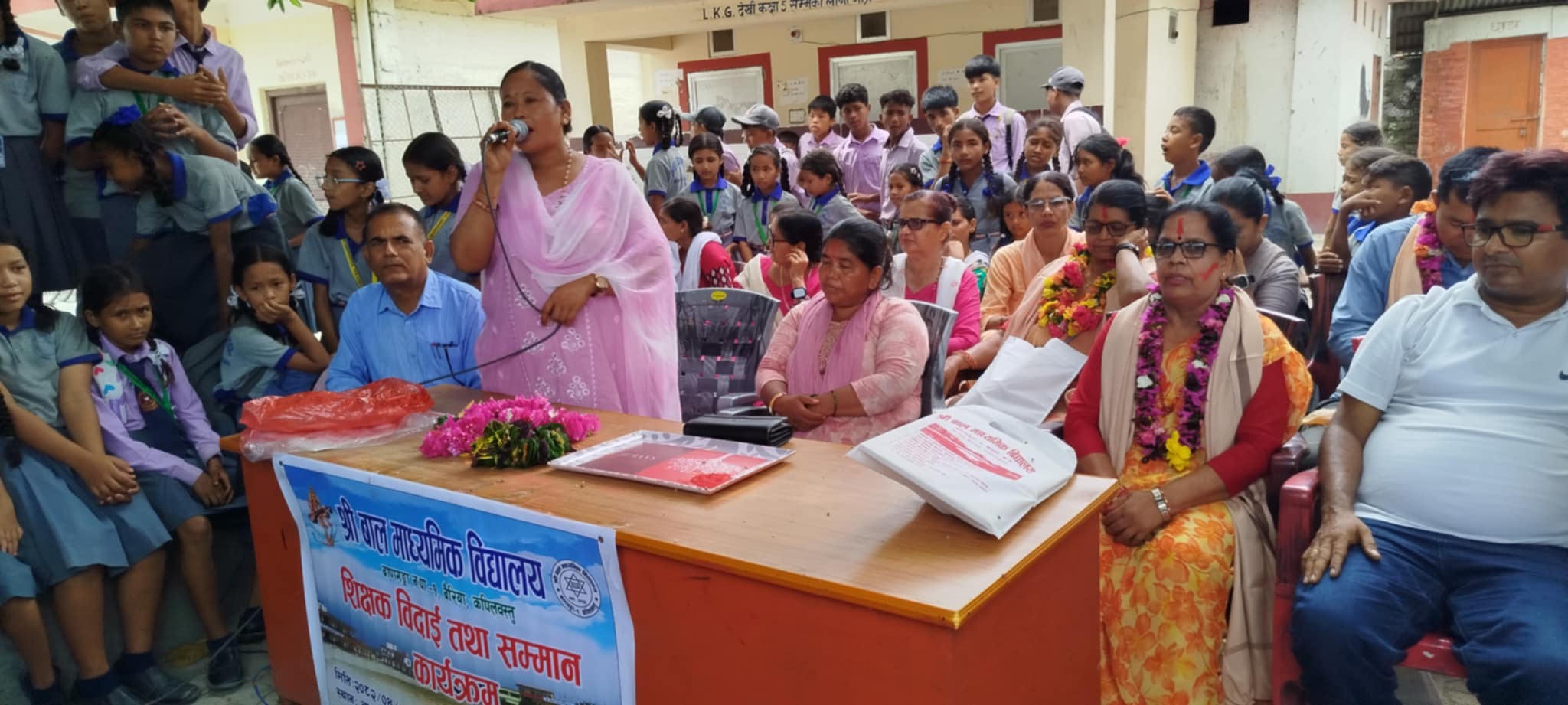 बाणगङ्गा १ मा अवस्थित श्री बाल माध्यमिक विद्यालयमा शुक्रवार विदाई तथा सम्मान कार्यक्रम भव्य रूपमा सम्पन्न भएको छ। विद्यालयबाट अवकाश प्राप्त गरेका दुइ शिक्षक र सरुवा भइ जानु भएका एक शिक्षक गरी ३ जनालाइ विदाई गरिएको हो। यसरी विदाई हुनेमा सीता पाण्डे, सुमित्रा पन्थी र पोम हिस्की शिक्षकहरूलाई मायाको चिनो र दोसल्ला ओढाएर सम्मान गरिएको हो।