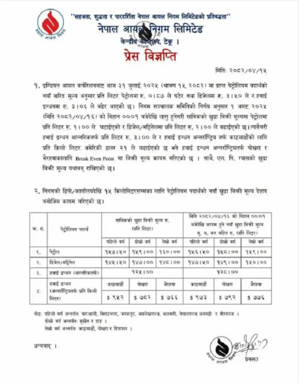 यस्तै काठमाण्डौ, पोखरा र दिपायल क्षेत्रमा अब पेट्रोलको भाउ लिटरको १५९ रूपैयाँ तथा डिजेल–मट्टीतेलको प्रतिलिटर १५० रूपैयाँ पुगेको छ ।