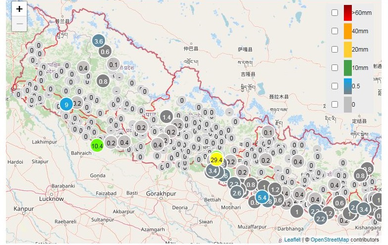 हिजो बेलुका दाङको पधमपुर, रोल्पाको केवार गाउँ र अर्घाखाँचीको रणसिंह वर्षामापन केन्द्र र आसपासका क्षेत्रमा मध्यम वर्षा भएको छ । गएराति झापामा एक सय १९ मिलिमिटर, सिरहामा ९८ दशमलव ६ मिलिमिटर र सप्तरीमा ९१ मिलिमिटर वर्षा मापन गरिएको छ ।